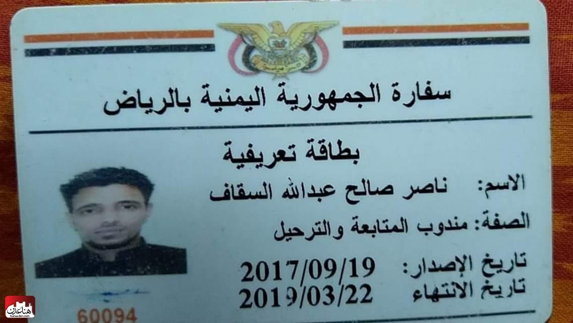وحصل هناعدن على بطاقة تعريفية يتعلق بالمدعوا ناصر حيث كان يعمل في السفارة مندوب المتابعه والترحيل.