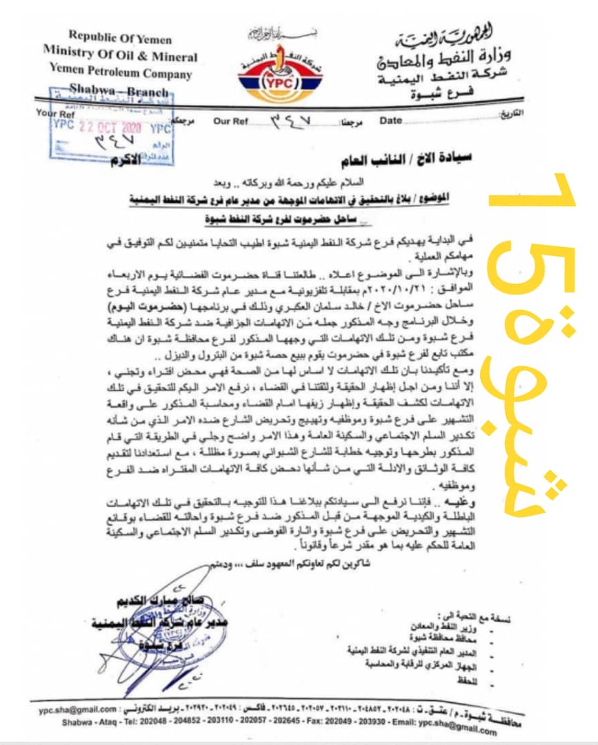 شركة النفط شبوة تقدم بلاغ للنائب العام تطلبه اجراء تحقيق فوري مع مدير شركة النفط اليمنية بساحل حضرموت.