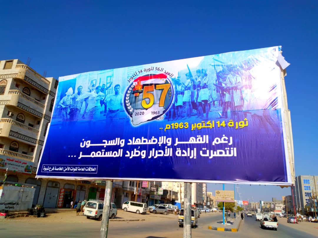 بدأت محافظة شبوة استعدادها، للاحتفال بالذكرى الـ 57 لثورة 14 من أكتوبر المجيدة واكتست شوارع مدينة عتق، والمؤسسات العامة بأعلام الجمهورية اليمنية، ورفعت صور فخامة...