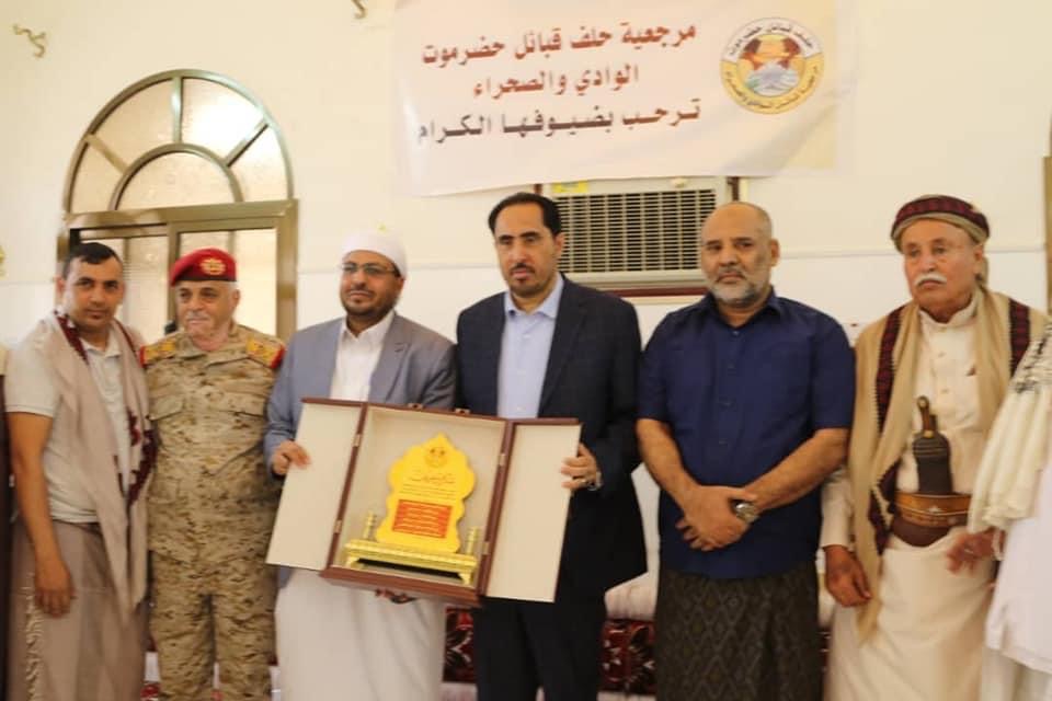 *وزراء من الحكومة الشرعية ومحافظ سقطرى يقومون بزيارة لمرجعية حلف قبائل حضرموت الوادي والصحراء*
