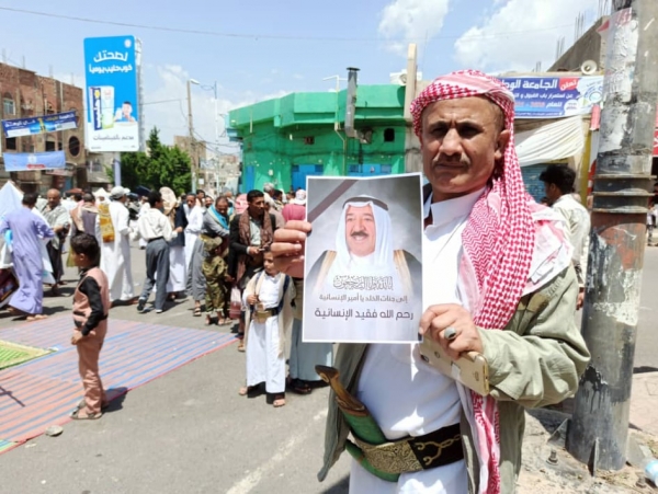 خرجت جماهير حاشدة بمحافظة تعز، الجمعة، لأداء صلاة الغائب على أمير دولة الكويت صباح الأحمد بساحة الحرية وسط المدينة.
