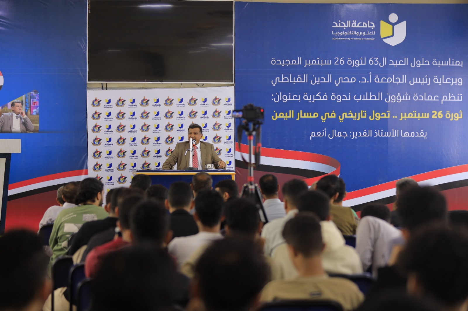 نظّمت عمادة شؤون الطلبة بجامعة الجند للعلوم والتكنولوجيا، صباح اليوم، ندوة فكرية بعنوان "ثورة 26 سبتمبر.. تحول تاريخي في مسار اليمن"، وذلك برعاية رئيس الجامعة أ.د....