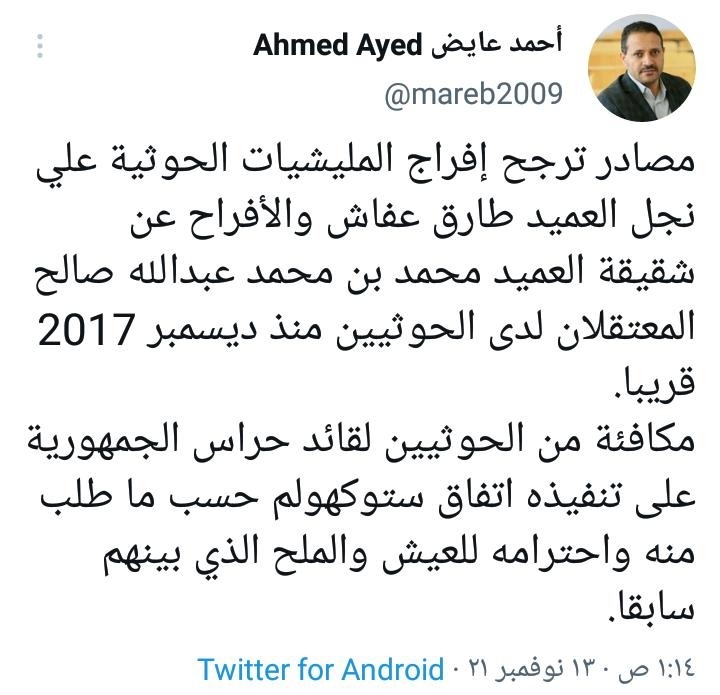 أكد السياسي أحمد عايض على ترجيح بعض المصادر عن إفراج مليشيا الحوثي قرييآ لنجل طارق عفاش والإفراج عن شقيقة المتحجزين لدى المليشيا منذ ديسمبر 2017م...