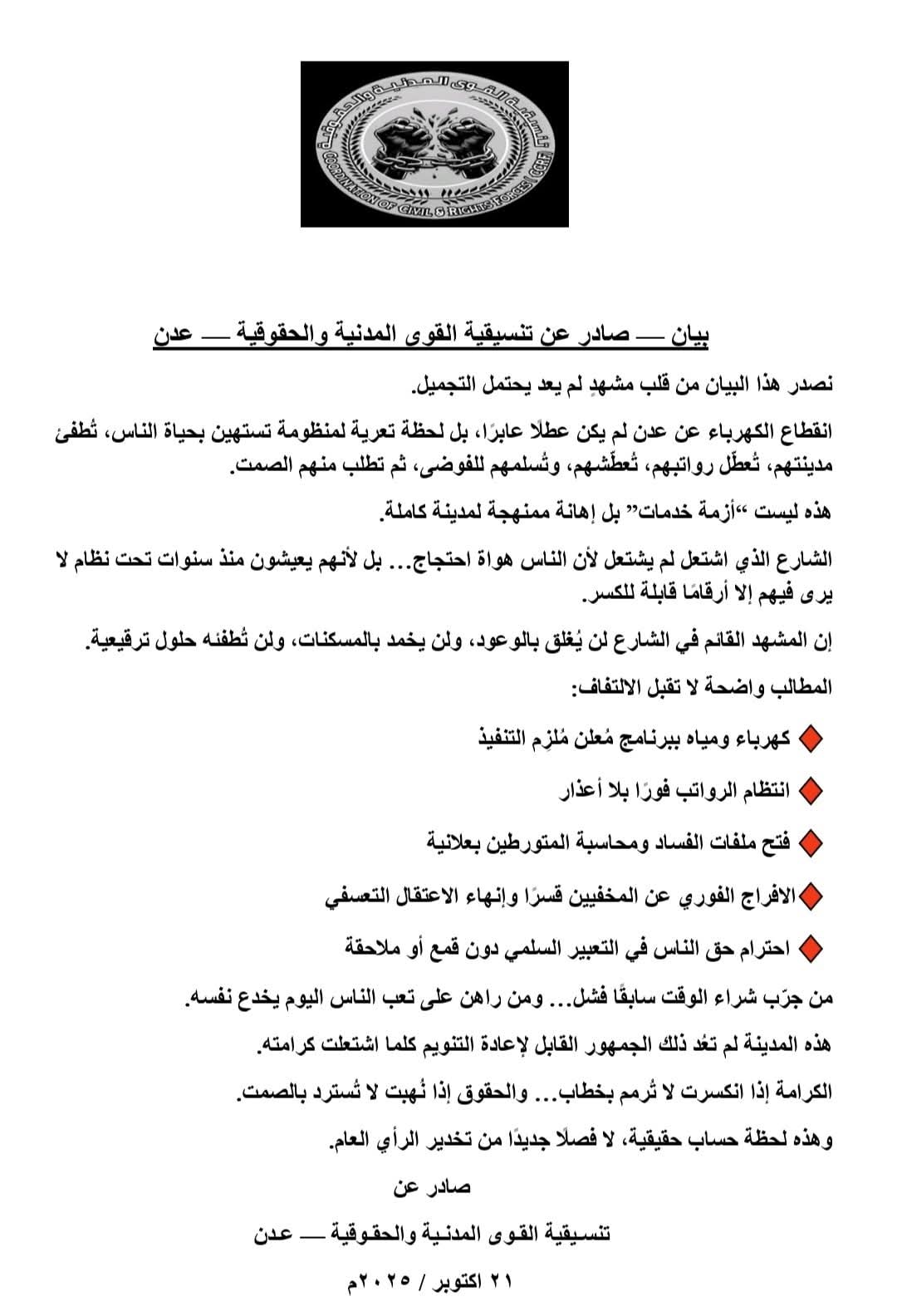 اصدرت تنسيقية القوى المدنية والحقوقية بالعاصمة عدن بيانا بخصوص الاوضاع الخطيرة المتردية التي تعيشها مدينة عدن اليوم.