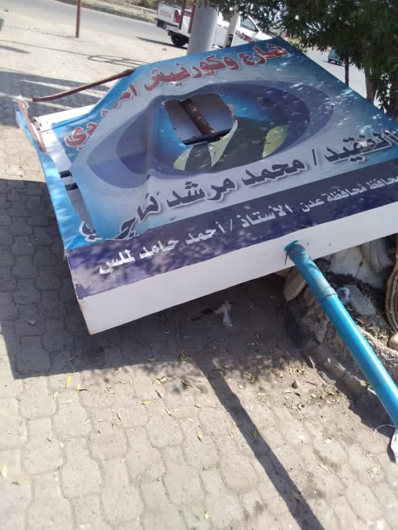 *قائد كبير في الحزام الأمني يعتدي بالتخريب والازالة على لوحة شارع وكورنيش المرشدي*
