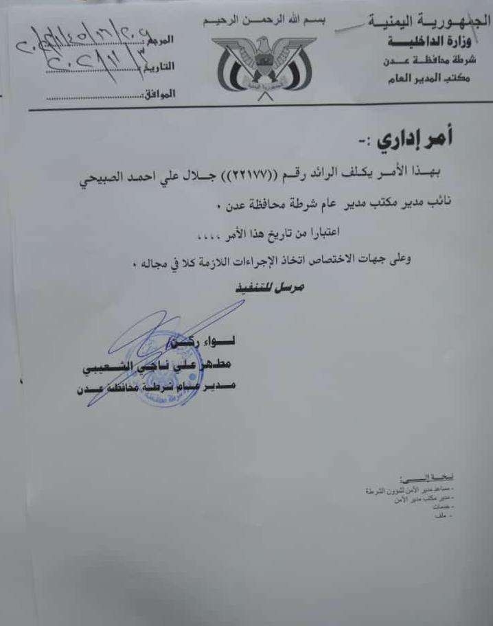 اصدر مدير عام شرطة العاصمة عدن اللواء مطهر علي ناجي الشعيبي امراً إدارياً قضى بتكليف الرائد جلال علي أحمد الصبيحي نائباً لمدير مكتب مدير عام شرطة...