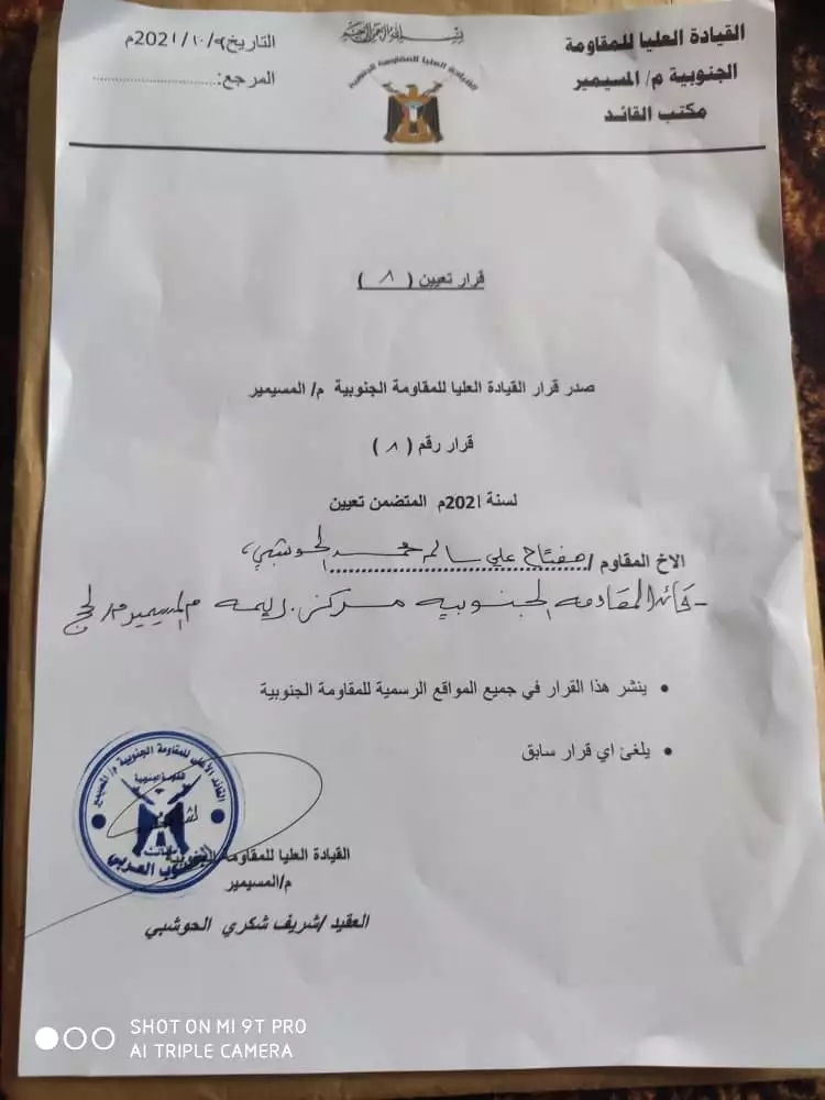 أصدر العقيد شريف شكري عمر سيف الحوشبي القائد الأعلى للمقاومة الجنوبية بالمسيمير محافظة لحج قرارا قضى بتعيين المناضل والشخصية الإجتماعية البارزة...