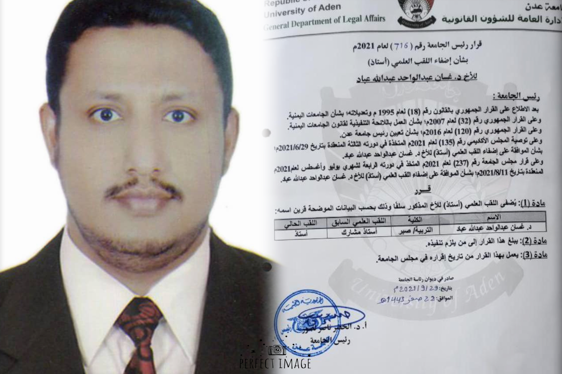 اقر مجلس جامعة عدن المصادقة على اضفاء اللقب العلمي "استاذ" للدكتور غسان عبدالواحد عباد نائب عميد كلية التربية...