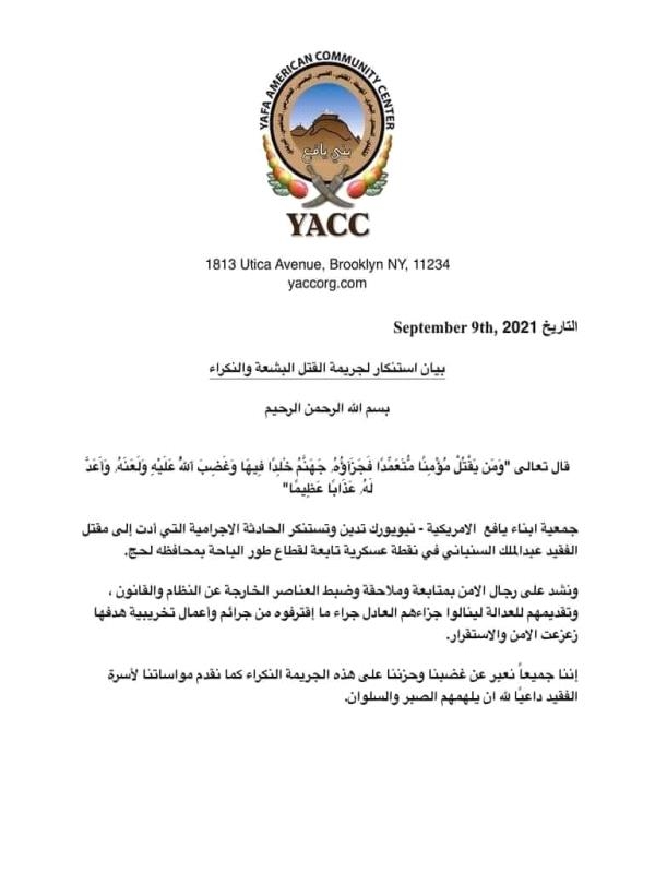 أصدرت جمعية أبناء يافع في مدينة نيويورك الأمريكية بيانها حول جريمة قتل الشاب عبدالملك السنباني بنقطة عسكرية في لحج ووصفتها بالجريمة البشعة والنكراء...
