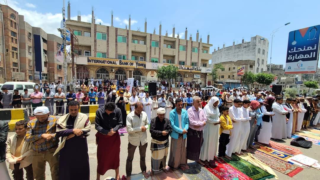 ابناء مدينة تعز يحتشدون للشهر الرابع على التوالي لاداء صلاة الجمعة في ساحة التصحيح امام مبنى السلطة المحلية بشارع جمال