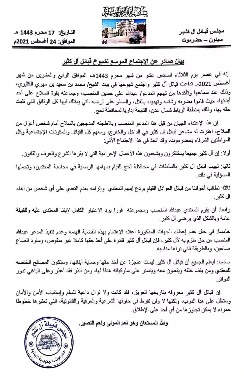 قام شيوخ قبائل آل كثير بحضرموت بإصدار بيان عقب اجتماع موسع لكافة مشائخها حول واقعة اعتداء عبدالله علي حسين المنصب وجماعته بقوة السلاح على احد...