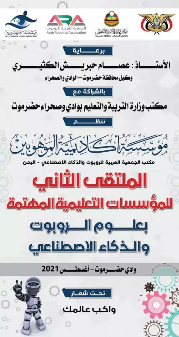 تنطلق اليوم فعاليات الملتقى الثاني للمؤسسات التعليمية المهتمة بعلوم الروبوت والذكاء الاصطناعي تحت شعار " واكب عالمك " تحت إشراف مكتب وزارة التربية...