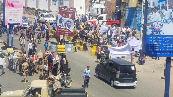 أقدم جنود من قوات 'اللواء السابع عشر' على إغلاق بوابة مقر محافظة تعز، احتجاجا على تدهور الحالة الصحية لأحد زملائهم، الذي يرقد في العناية المركزة بمستشفى 'الروضة'.