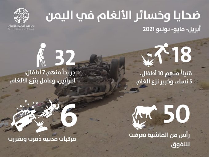 أكد المرصد اليمني للألغام، أن 18 شخصاً بينهم 10 أطفال و5 نساء، قتلوا خلال ثلاثة أشهر، جراء الألغام التي زرعتها جماعة الحوثي في عدد من المناطق اليمنية الملوثة...