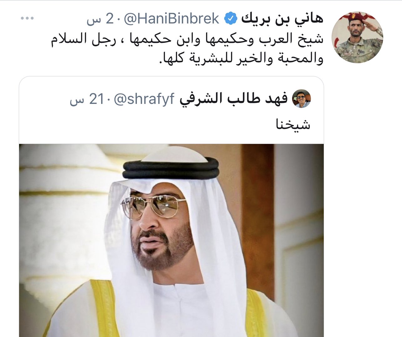 شن كاتب سعودي هجوما عنيفا على نائب رئيس المجلس الانتقالي هاني بن بريك، وفهد طالب الشرفي، بسبب تسابقهما على التزلف لولي عهد أبوظبي محمد بن زايد، عبر تغريدات على...