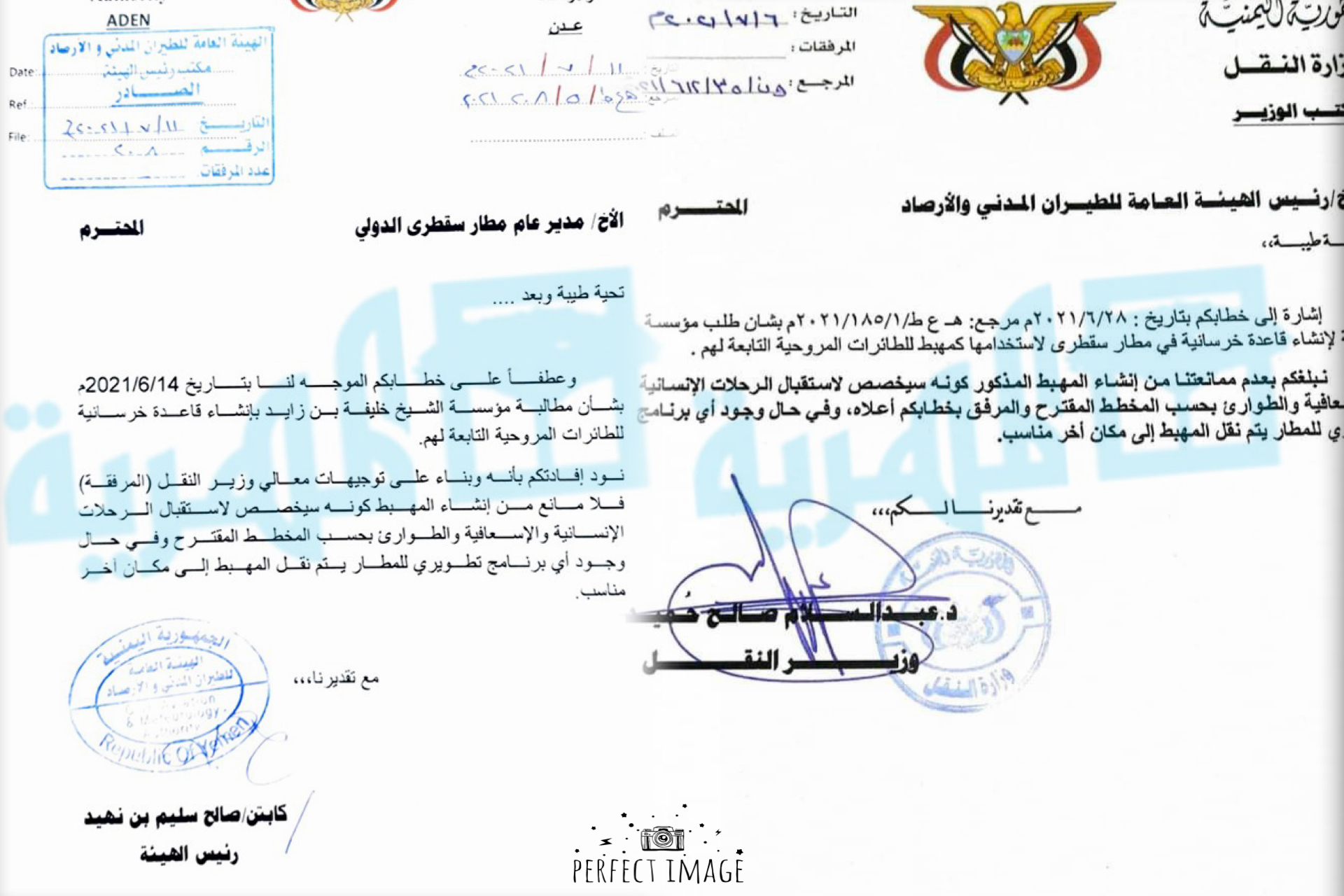 حصلت قناة "المهرية" على وثيقة رسمية تكشف توجيه وزير النقل التابع للانتقالي عبدالسلام حميد، بإنشاء مهبط للطائرات الإماراتية في جزيرة سقطرى.