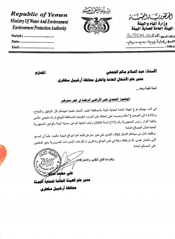 كشفت الهيئة العامة لحماية البيئة في محافظة أرخبيل سقطرى، عن تكرار حالات اعتداء على مواقع بيئية في المحافظة.