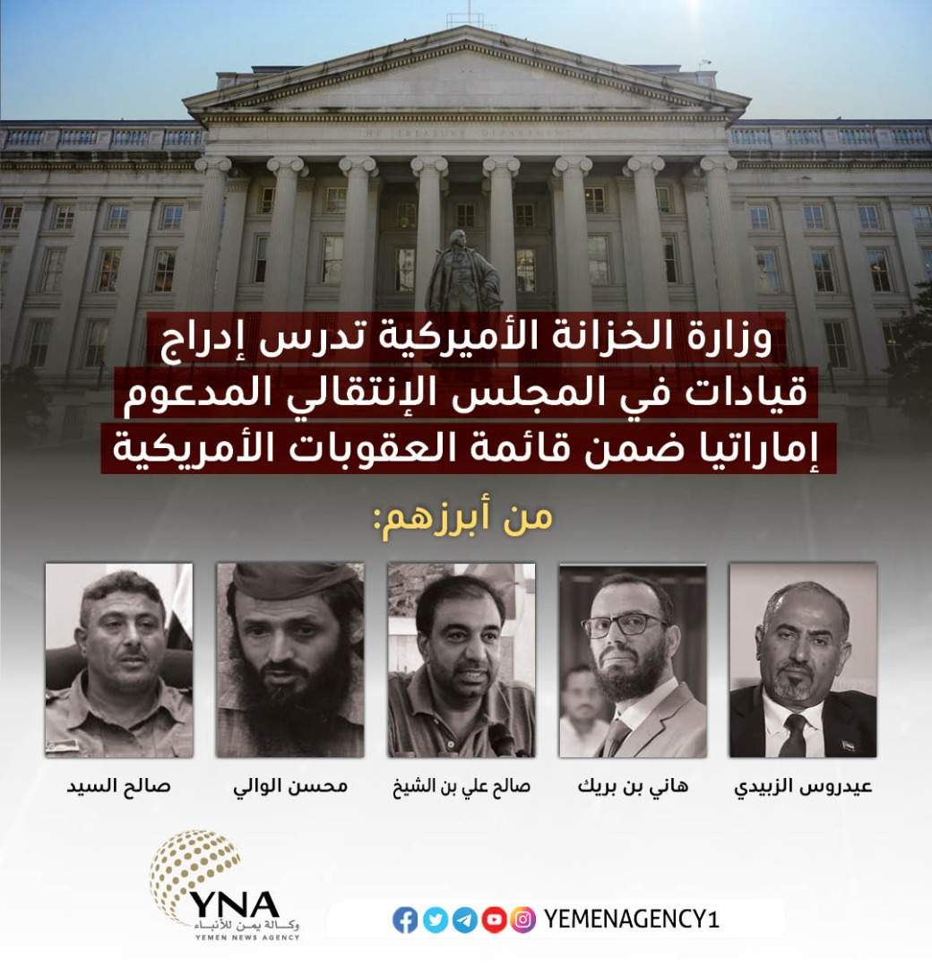 كشف مصدر خاص لـ"وكالة يمن للأنباء" عن نية وزارة الخزانة الأمريكية إدراج عدد من قيادات ما يعرف بـ"المجلس الانتقالي الجنوبي" المدعوم إماراتيًا، ضمن قائمة العقوبات...