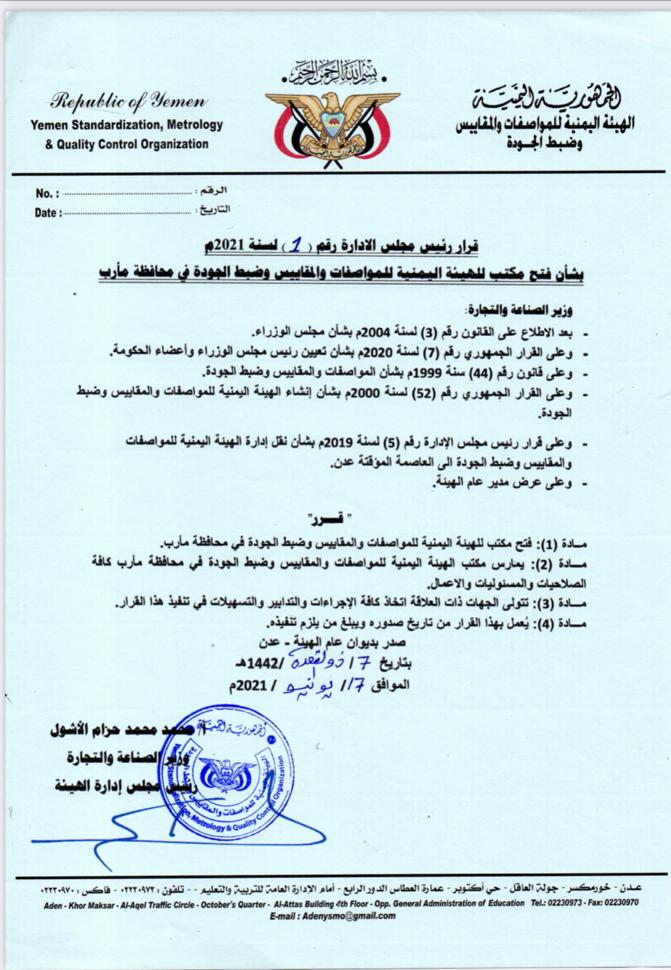 *معالي وزير الصناعة والتجارة "الاشول"يصدر قراراً بانشاء مكتب للهيئة اليمنية للمواصفات بمحافظة مأرب*