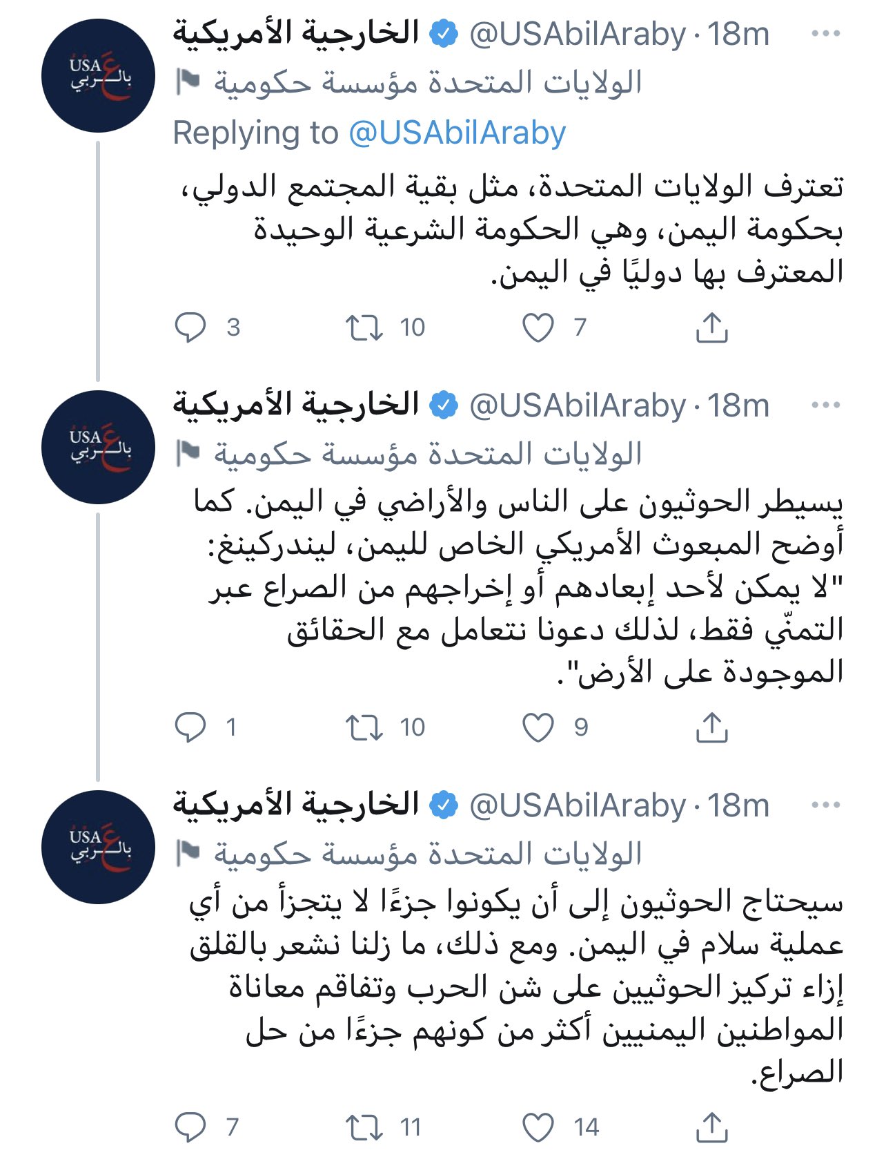 واشنطن توضح موقفها من الصراع في اليمن: الحكومة هي الشرعية الوحيدة والحوثيون أمر واقع ولا يمكن إبعادهم بالتمني