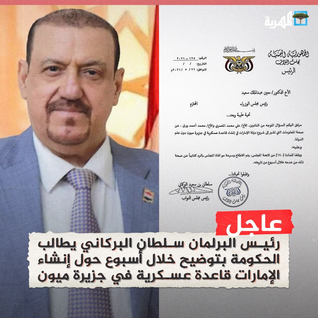 طالب رئيس البرلمان سلطان البركاني الحكومة بتقديم توضيح حول ما أثير عن بناء الإمارات قاعدة عسكرية في جزيرة ميون اليمنية دون إذن من الشرعية.