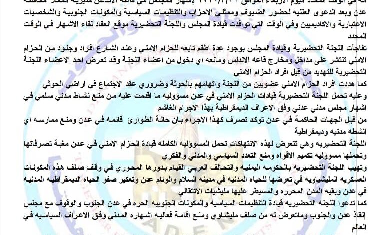 أصدرت اللجنة التحضيرية لـ”مجلس إنقاذ عدن والجنوب ” ، قبل قليل ، بياناً استنكرت فيه قيام قوة تابعة للحزام الأمني بمنع إقامة فعالية إشهار المجلس في محافظة عدن .