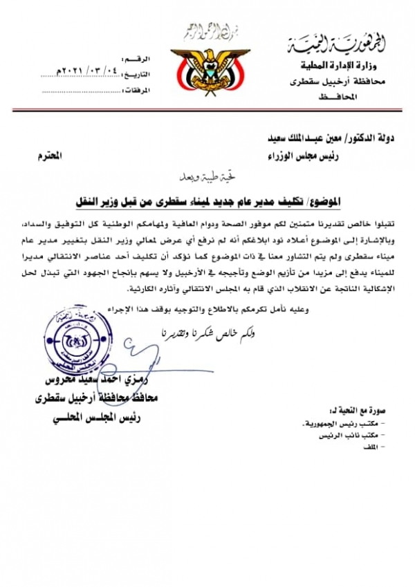 نفى محافظ سقطرى رمزي محروس، ترشيح أي شخصية لإدارة ميناء سقطرى، بعد قرار وزير النقل المحسوب على الانتقالي عبدالسلام حميد بتكليف مدير للميناء وإقالة المدير رياض...