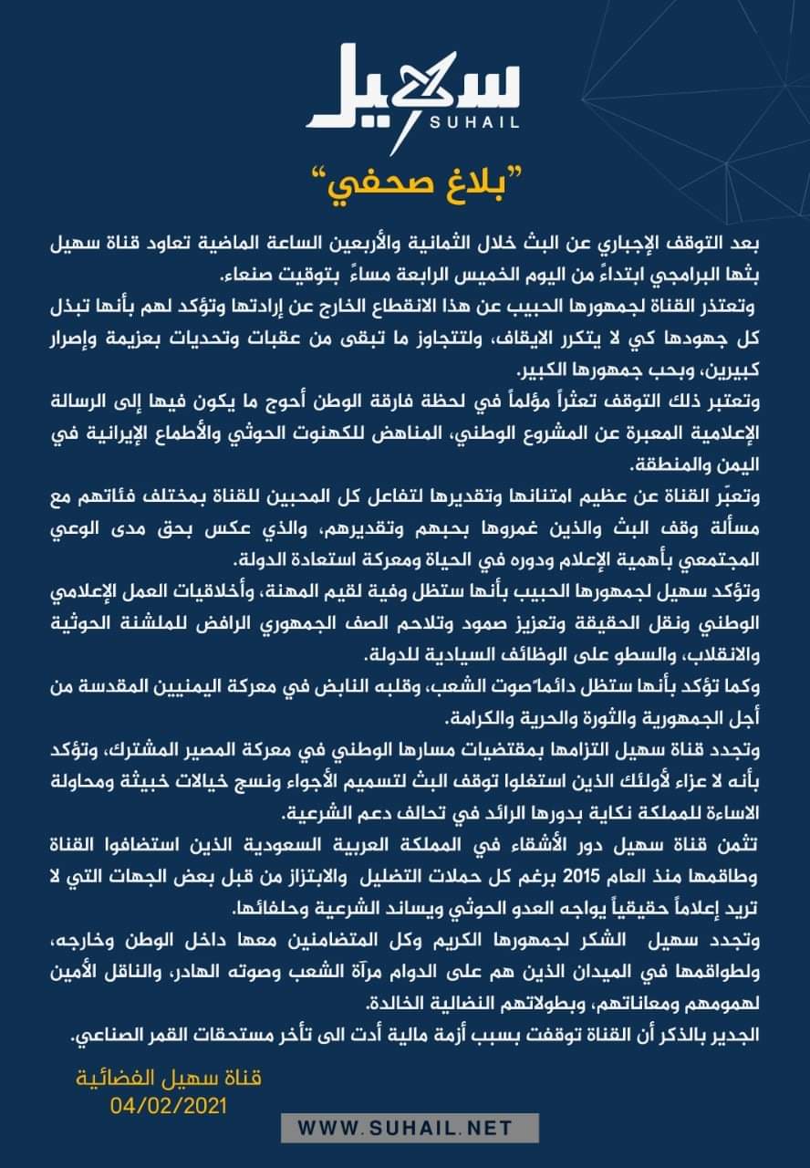 سهيل تعاود البث وتؤكد أنها ستظل دائما ًصوت الشعب وقلبه النابض في معركته ضد الكهنوت (بلاغ صحفي)