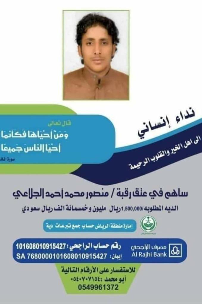 أسرة الجلاعي وكافة قبيلة آل حاتم بمودية يشكرون كل من تبرع وساهم في عتق رقبة ولدهم (منصور محمد الجلاعي)